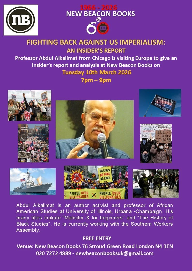 "Fighting back against US imperialism": An insider's report given by Abdul Alkalimat Tuesday 10 March 2026 7:00 pm 9:00 pm 19:00 21:00 New Beacon Books 76 Stroud Green Road London, England, N4 3EN United Kingdom (map) Google Calendar ICS